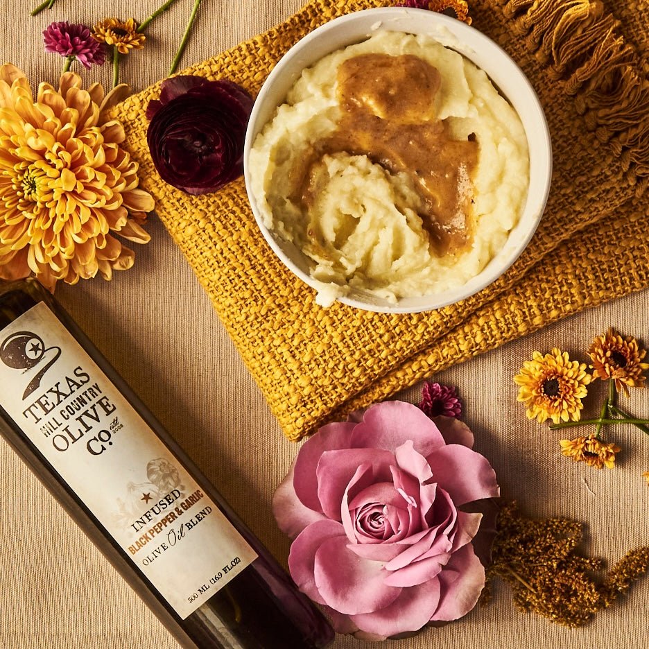 Olive Oil Mashed Potatoes with Black Pepper Garlic Infused Olive Oil