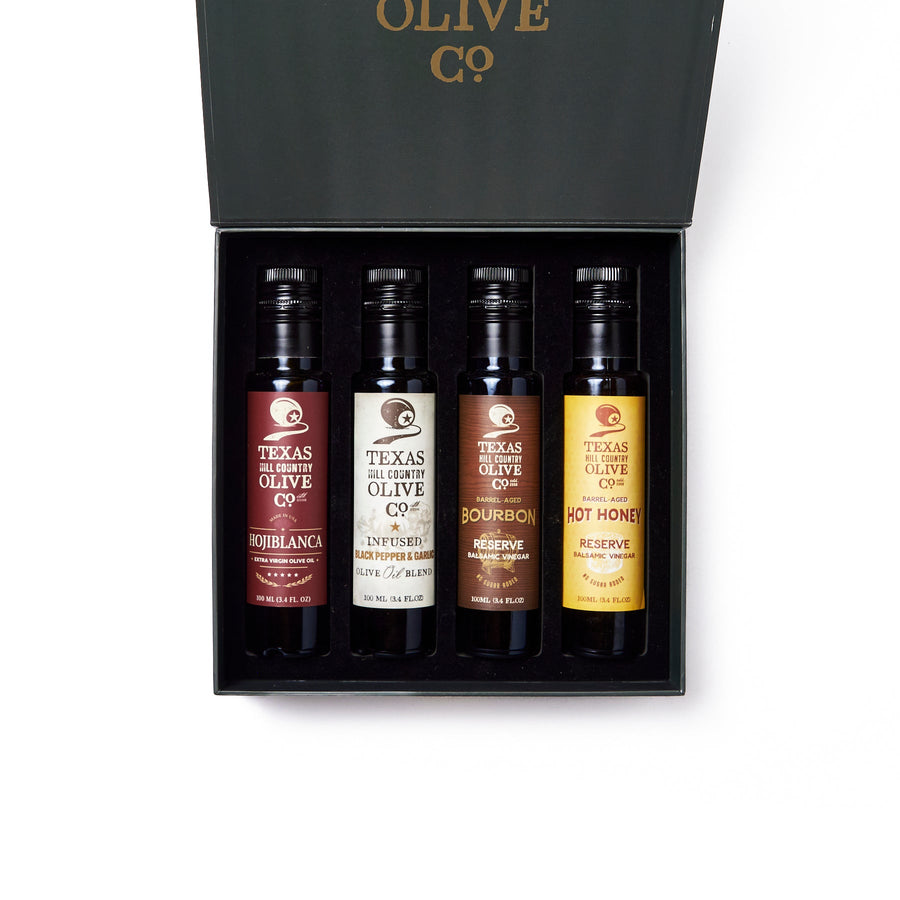 Featuring our best sellers, this set includes 100ml bottles of Hojiblanca Extra Virgin Olive Oil, Black Pepper Garlic Infused Olive Oil, Hot Honey Balsamic Vinegar, and Bourbon Reserve Balsamic Vinegar. Packaged in an exclusive keepsake box with a satin ribbon, it’s the perfect gift for the holiday season if you're looking for holiday food gifts for loved ones.